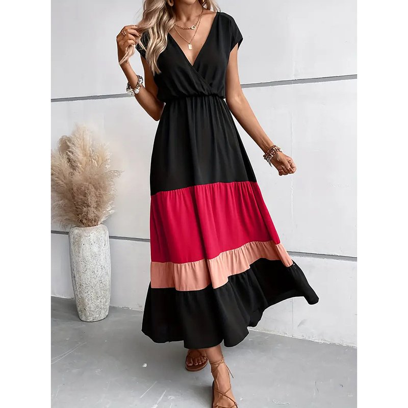 Women’s Color Block Maxi Dress – V-Neck Sleeveless Tiered Sundress for Summer